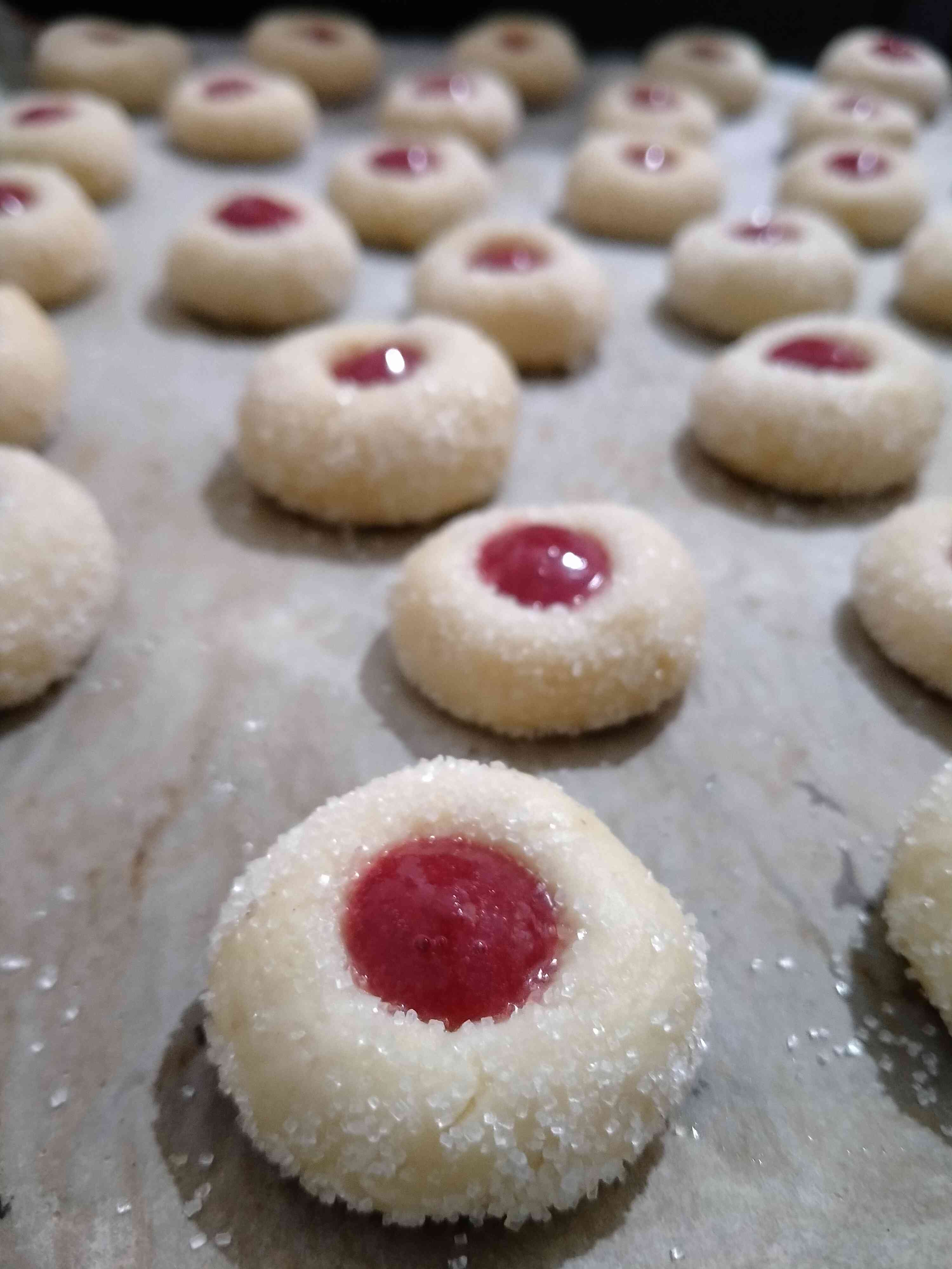 Toz şeker ve çilek marmeladı hariç tüm malzemeler karıştırılıp yoğurulur.Yumusak ele yapışmayan bir hamur olmalı ve toplandıktan sonra fazla yogurulmamalı.Ceviz büyüklüğünde yuvarlayıp,toz şekere bulayın.Tepsiye aralıklı dizip ortasını oklavayla havuz yapın.Havuza ben çilek marmeladı koydum, siz istediğiniz bir reçel veya marmelat koyabilirsiniz.Önceden ısıtılmış 180derece fanlı fırında beyaz kalacak şekilde pişirin.Bu kurabiyeler birgün sonra daha lezzetli olur.Oda sıcaklığında kavanozda veya derin dondurucuda muhafaza edebilirsiniz.Afiyet olsun..