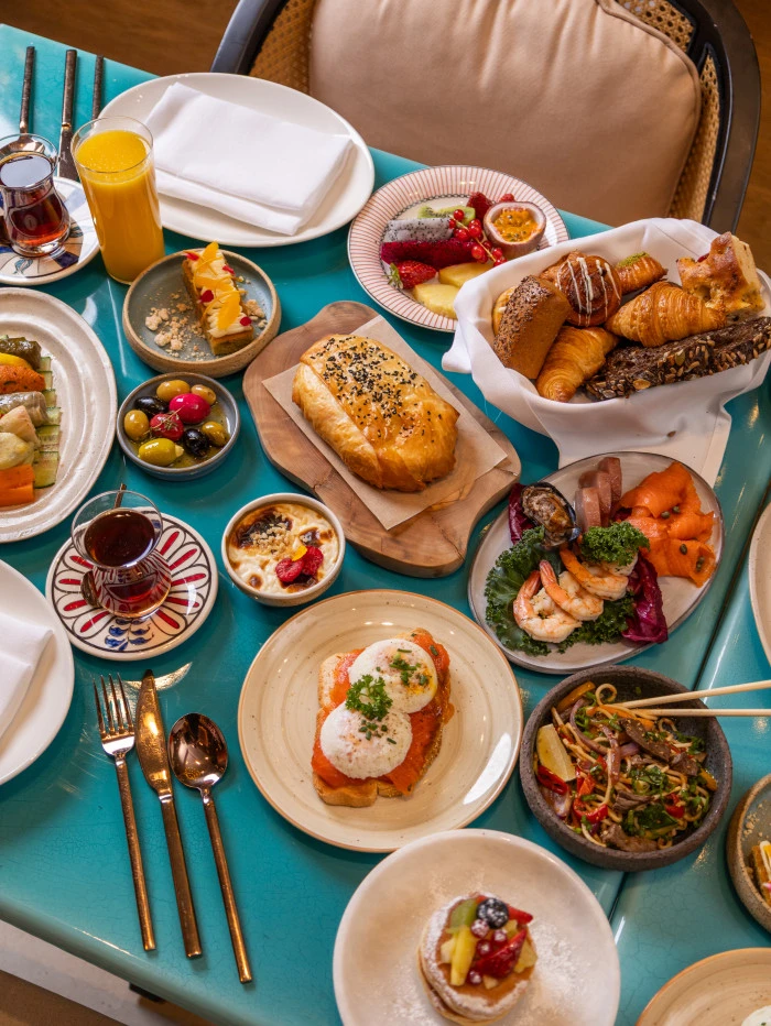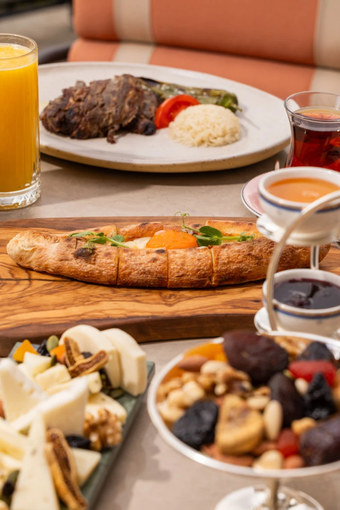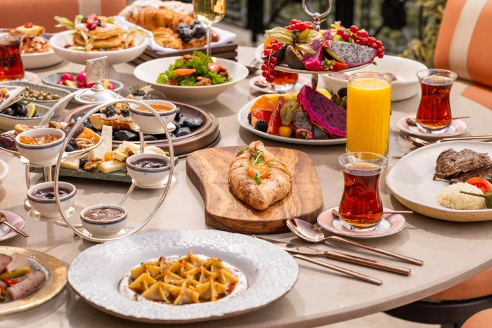Açık büfede yer alan gurme lezzetler, Türkiye’nin farklı bölgelerinden özenle seçilmiş peynir ve zeytin çeşitlerinden, saray pastanesinden çıkan sıcak lezzetlere, artizan ekmeklerden ev yapımı reçellere uzanan zengin bir seçki sunuyor. Mevsimsel salatalar, özenle hazırlanan zeytinyağlılar ve klasik tatların rafine yorumları, bu buluşmaya katmanlı bir derinlik kazandırıyor.
