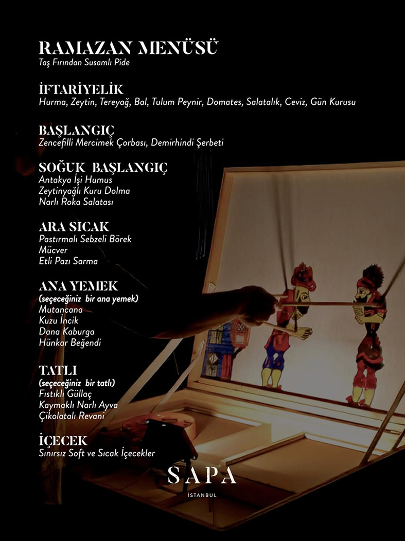 Sapa İstanbul’da Şef Ümit Dere’nin hazırladığı Ramazan ayına özel menüsünde, geleneksel Anadolu mutfağının zengin tatlarını modern dokunuşlarla sunuyor ve iftar sofralarına hem nostaljik hem şık bir lezzet deneyimi katıyor. Menünün başlangıcında taş fırından susamlı pide, hurma, peynir çeşitleri ve mezeler yer alır; zencefilli mercimek çorbası ve Osmanlı şerbeti ile devam eder. Ara sıcaklar arasında zeytinyağlı kuru dolma, pastırmalı humus ve salata bulunur. Ana yemeklerde hünkar beğendi, kuzu tandır, dana antrikot gibi seçenekler vardır ve tatlı olarak fıstıklı güllaç, narlı ayva veya çıtır kabak sunulur. Menü sınırsız soft içeceklerle tamamlanır.