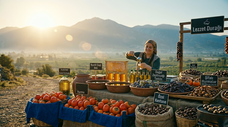 Nazilli Dağı’nın her ürünü, doğayla insan emeğinin sabırlı bir buluşmasının sonucudur. Zeytinler, ağaçlardan tek tek özenle toplanır; erken hasatın en kıymetli anlarında sıkılarak altın değerinde zeytinyağına dönüşür. Dağ inciri ve cennet hurması, dalından koparılırken zarar görmemesi için büyük bir dikkat ister; güneşte kurutulurken ise günler süren sabırla gerçek lezzetine ulaşır. Domatesler dilimlenir, yaz güneşinde tek tek çevrilerek kurutulur; her bir parça, emeğin izini taşır.