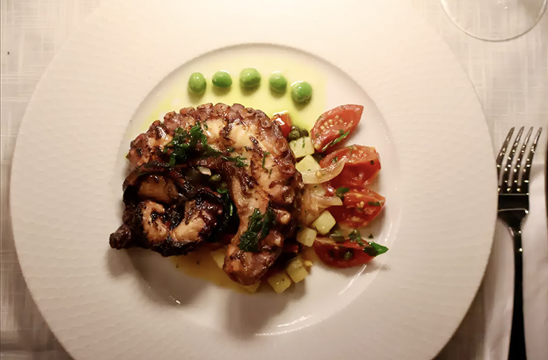 Bir başka imza tabağı ise “Deniz ve Toprak”. Izgara ahtapot, toprağa gömülerek pişirilmiş pancar ve fermente sarımsak püresiyle buluşuyor. Tabağın altında gizli bir sürpriz var: deniz yosunu andıran, yosunla tatlandırılmış bir toprak kırıntısı. İlk lokmada deniz, ikinci lokmada orman tadı alıyorsunuz.