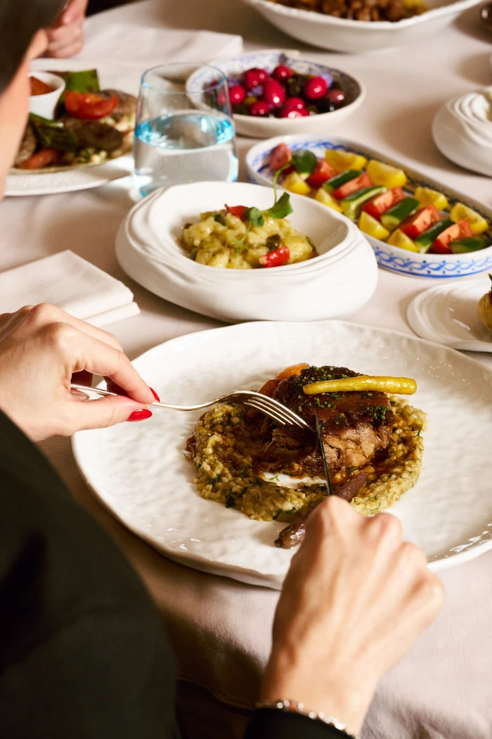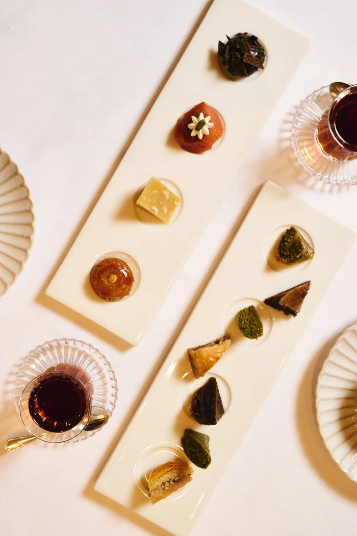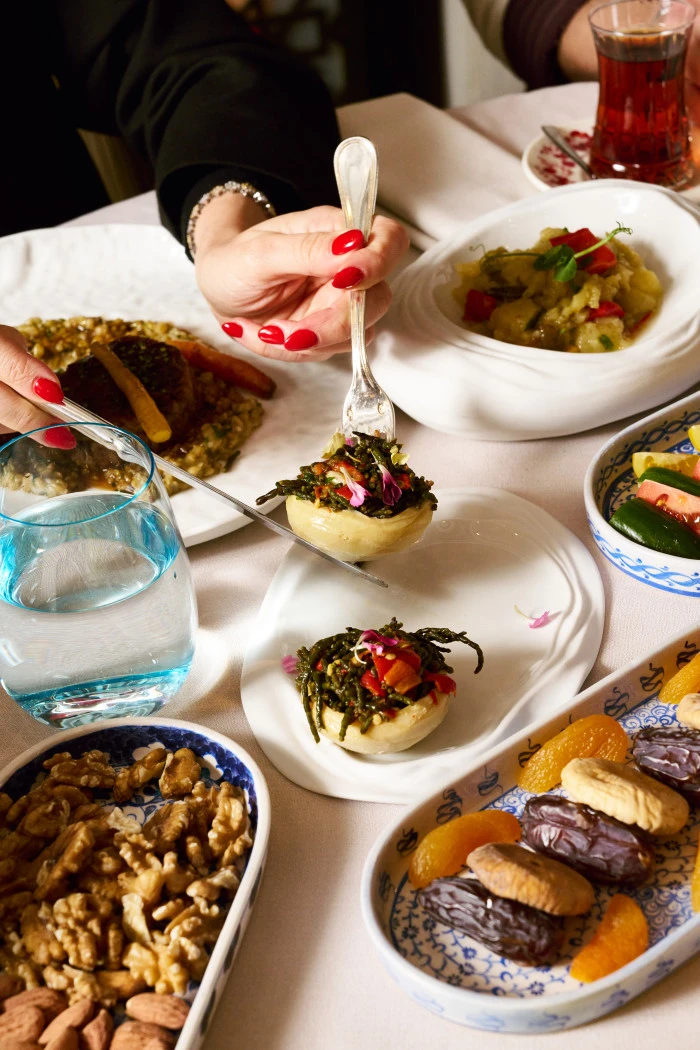 Terasın özel noktalarından birinde konumlanan Ocakbaşı ise daha butik bir atmosfer arayanlar için dört aşamalı bir set menü sunuyor. Menü, mercimek çorbası ile başlıyor; pastırma, bal ve manda kaymağı, tulum peyniri ve hurma gibi iftariyeliklerin yanı sıra humus, babagannuş, muhammara ve haydari gibi klasik mezeler sofraya geliyor. İçli köfte ve pazı dolmasının ardından ana yemekte ocakbaşı mutfağının güçlü temsilcisi Adana kebap sunuluyor. Final, şerbetli ve sütlü tatların bir arada yer aldığı karışık Türk tatlı tabağı ile yapılıyor.