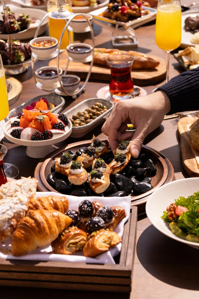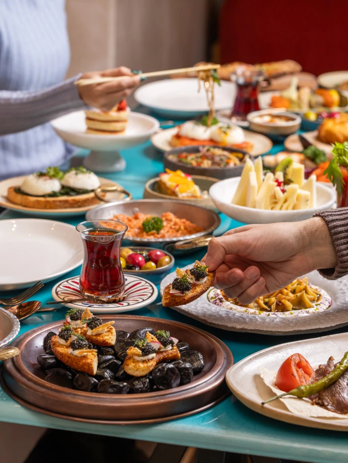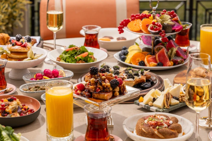 Açık büfede yer alan gurme lezzetler, Türkiye’nin farklı bölgelerinden özenle seçilmiş peynir ve zeytin çeşitlerinden, saray pastanesinden çıkan sıcak lezzetlere, artizan ekmeklerden ev yapımı reçellere uzanan zengin bir seçki sunuyor. Mevsimsel salatalar, özenle hazırlanan zeytinyağlılar ve klasik tatların rafine yorumları, bu buluşmaya katmanlı bir derinlik kazandırıyor.