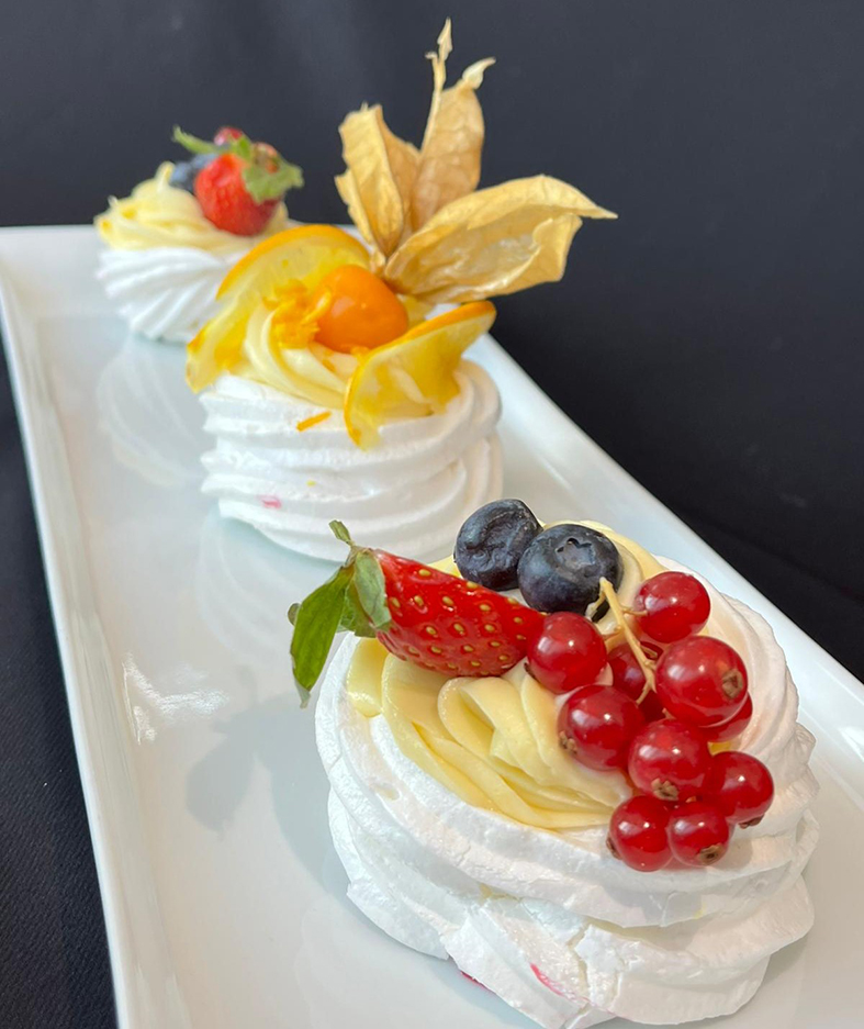 Tatlı ve pastane ürünleri: Pavlova yapımı, pandispanya hazırlama teknikleri, çeşitli ikramlık kurabiyeler ve modern pastacılık sunumları