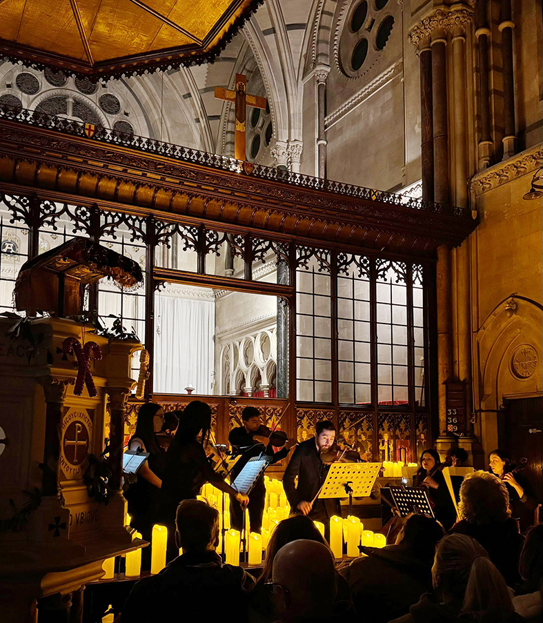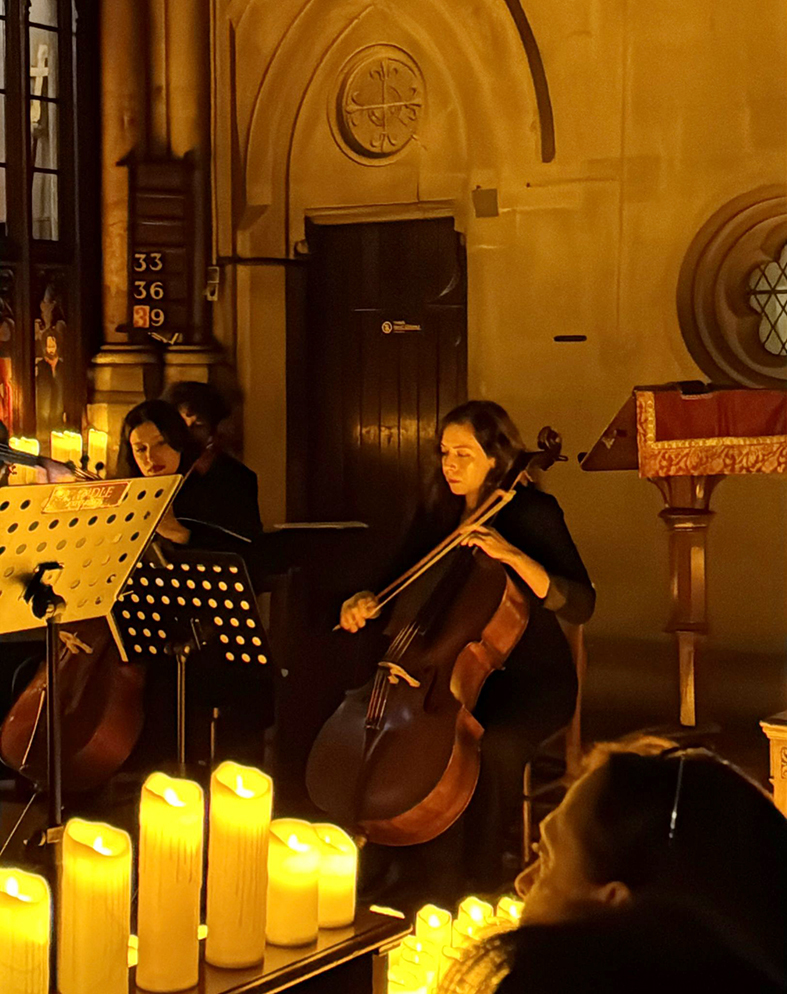 Yüzlerce mumun yarattığı yumuşak ışık, mimari detayları ön plana çıkarırken aynı zamanda dinleyiciyi tamamen atmosferin içine çekiyor. Bu bütünlük içinde müzik ve mekân birbirini tamamlıyor; ortaya sade ama etkileyici bir deneyim çıkıyor.