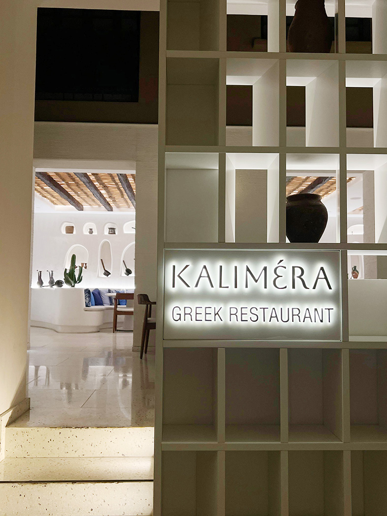 Adını Yunanca “günaydın” anlamına gelen kelimeden alan restoran, misafirlerini daha içeri adım attıkları anda beyaz ve mavinin enerjisiyle karşılıyor. İstanbul’un tüm dinamizmine rağmen, burada Ege esintisi hissedilir düzeyde: beyaz-mavi renk paleti, doğal dokular ve ferah ışıklandırma.